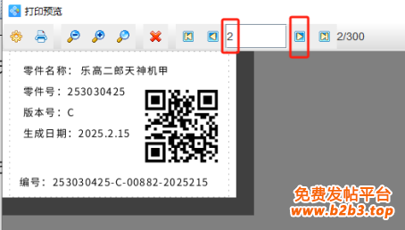 5. 制作完成之后,点击软件顶部的“打印”按钮,在打开的窗口中设置数据量为300,开始页码为1,点击结束页码后面的尾页,然后点击下面的“预览”按钮,翻页查看批量生成的流水二维码标签,预览无误就可以直接连接打印机打印出来了。